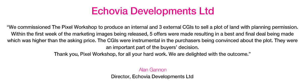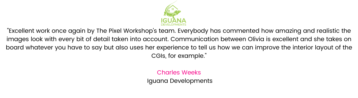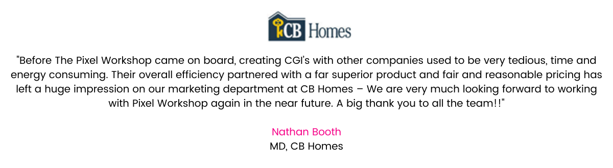 Below are a selection of reviews from satisfied clients across the UK, summarising their views about our architectural rendering and property CGI services. While The Pixel Workshop is local to Manchester, Cheshire and Leeds, we are a long-established company serving the whole of the UK.